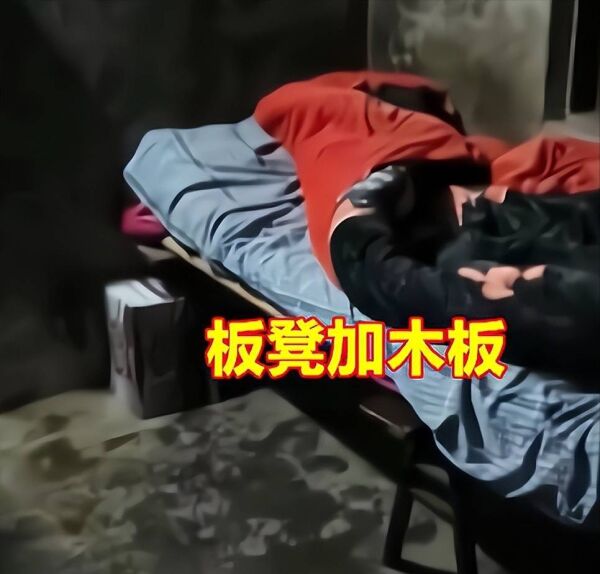 老人睡的床也很简单,由两张长椅和几块木板搭成,老人就这样坐在床上,表情很无奈。