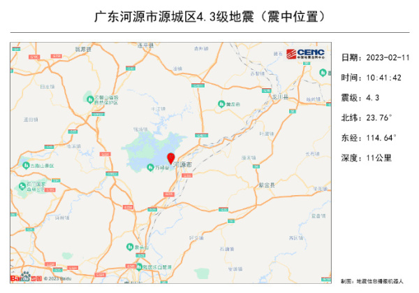 导读:据中国地震台网正式测定:2月11日10时41分在广东河源市源城区(北纬23.76度,东经114.64度)发生4.3级地震,震源深度11千米。