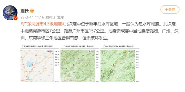中国地震台网消息,2月11日10时41分在广东河源市源城区(北纬23.76度,东经114.64度)发生4.3级地震,震源深度11千米。 @震长 发布,此次震中位于新丰江水库区域,一般认为是水库地震。此次震中距离河源市区7公里,距离广州市区157公里。地震造成震中当地震感强烈,广州、深圳、东莞等珠三角地区普遍有感,但无破坏发生。
