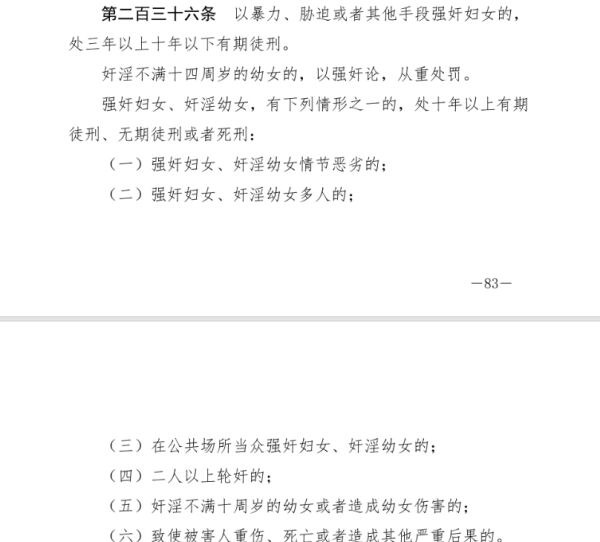 强奸妇女、奸淫幼女,有下列情形之一的,处十年以上有期徒刑、无期徒刑或者死刑:(一)强奸妇女、奸淫幼女情节恶劣的;(二)强奸妇女、奸淫幼女多人的;(三)在公共场所当众强奸妇女、奸淫幼女的;(四)二人以上轮奸的;(五)奸淫不满十周岁的幼女或者造成幼女伤害的;(六)致使被害人重伤、死亡或者造成其他严重后果的。