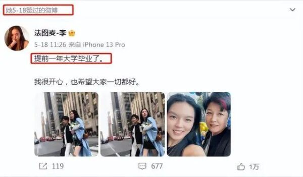 今年5月7日,法图麦·李的母亲哈文也微博发文透露女儿大学毕业的好消息,并表示这是“女儿送给自己21岁生日最好的礼物。”同月的18日,法图麦·李自己也发文称,自己是提前一年大学毕业,并直言自己很开心。