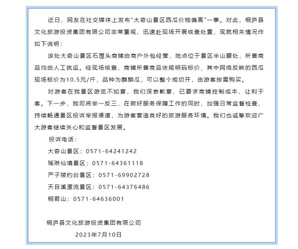 近日,网友在社交媒体上发布“大奇山景区西瓜价钱偏高”一事。对此,桐庐县文化旅游投资集团有限公司非常重视,迅速赴现场开展核查处置,现就相关情况作如下说明: