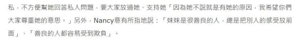 不过,李玟的姐姐到现在还是选择了保持沉默,台媒询问她相关传闻,她都还是选择了避开,她表示对于外界传闻:“她不说就是有她的原因,我希望你们尊重她的意思”,另外她表示,“妹妹是很善良的人,总是把别人的感受放在前面,善良的人都容易受到欺负”。