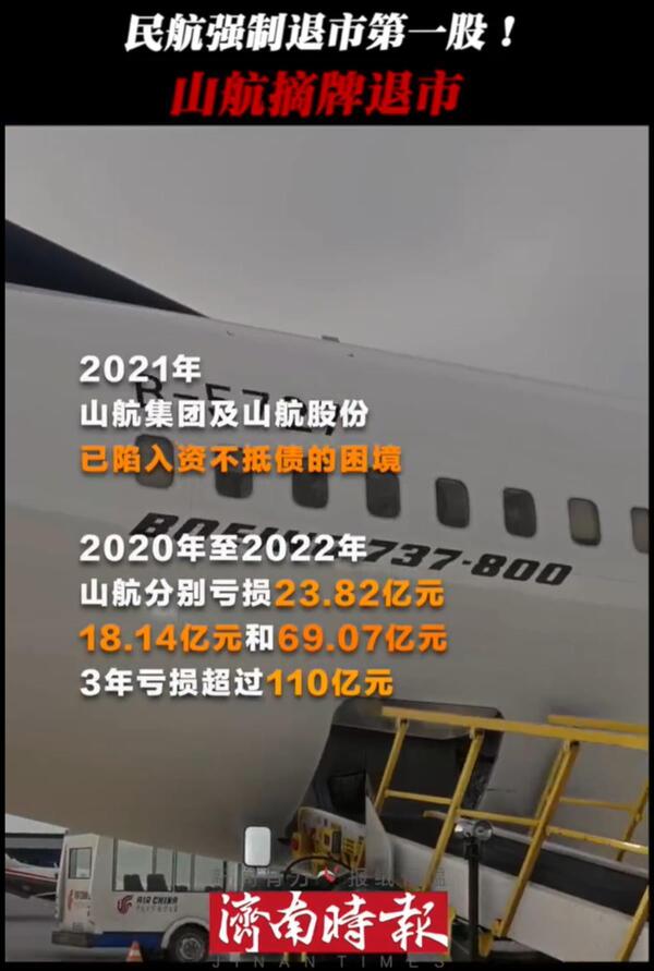 导读:7月10日,山航B退正式从深交所摘牌退市,成为业内首家被强制退市的航空公司。据悉,山航集团及山航股份已陷入资不抵债的困境,3年亏损超过110亿元。