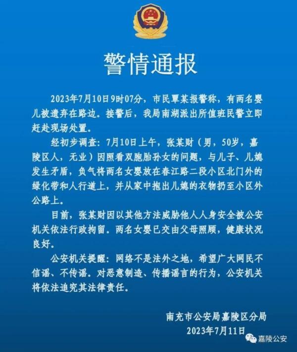 经初步调查:7月10日上午,张某财(男,50岁,嘉陵区人,无业)因照看双胞胎孙女的问题,与儿子、儿媳发生矛盾,负气将两名女婴放在春江路二段小区北门外的绿化带和人行道上,并从家中抱出儿媳的衣物扔至小区外公路上。