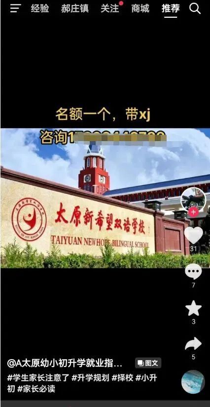 与此同时,在某短视频平台,有人公然代办入学,背景图片为太原新希望双语学校,内容为“名额一个,带xj”(xj意为学籍)。