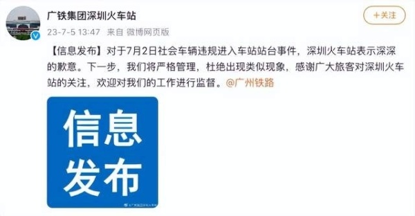 7月5日,广铁集团深圳火车站发文致歉:对于7月2日社会车辆违规进入车站站台事件,深圳火车站表示深深的歉意。下一步,我们将严格管理,杜绝出现类似现象,感谢广大旅客对深圳火车站的关注,欢迎对我们的工作进行监督。