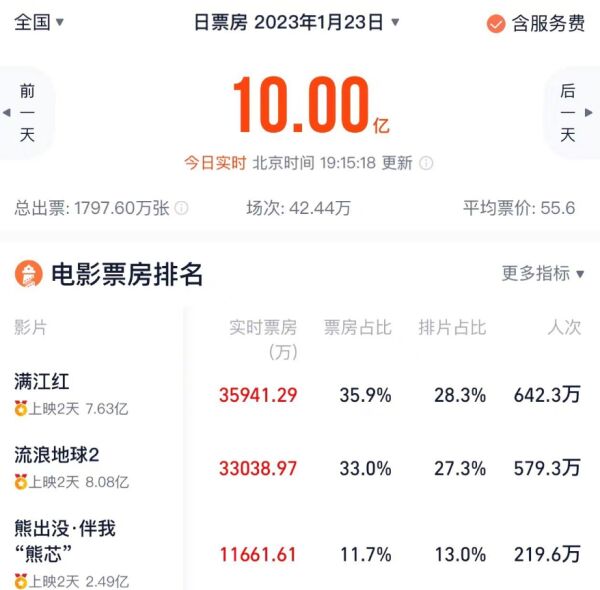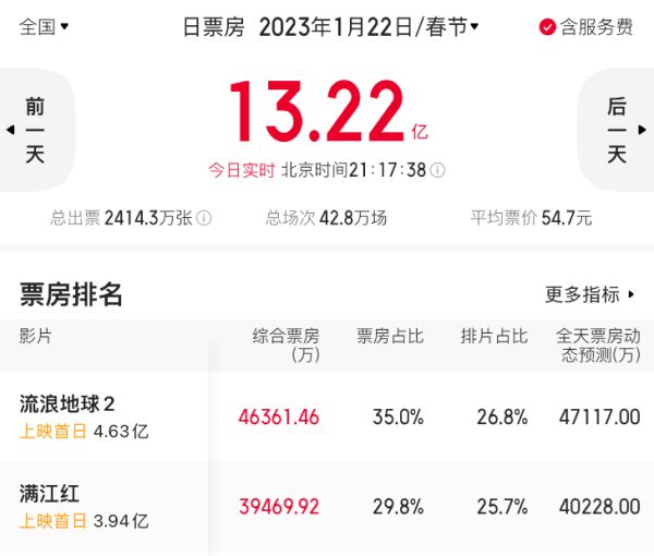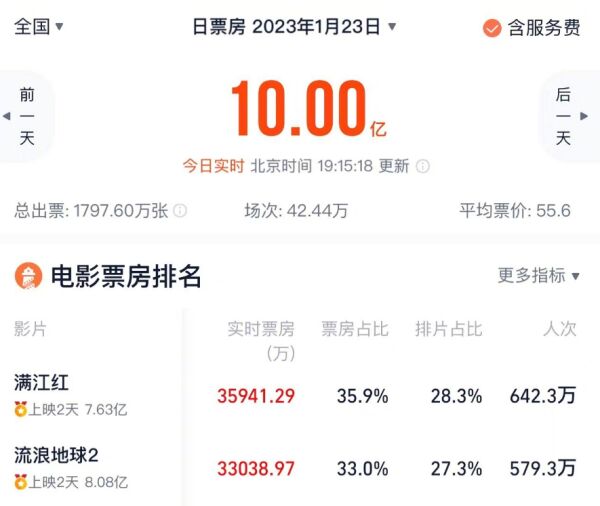 但是在1月23日,众多影院都增大了《满江红》的排片,减少对《流浪地球2》的排片,排片量的增长为《满江红》的票房走势又注入了一丝活力,让该片能够继续跟《流浪地球2》形成你追我赶的态势,截止目前,《流浪地球2》的单日票房已经被《满江红》反超,《满江红》位列第一。