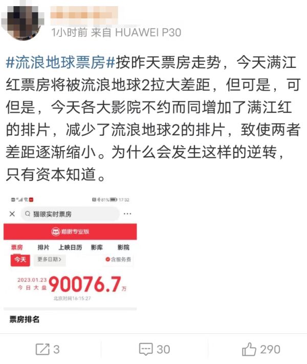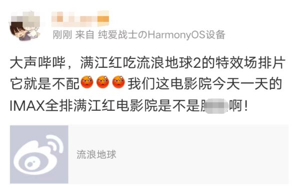 不止一位网友提到这一点,很多网友都发帖表示,发现《球2》票房、口碑高于《满江红》,但是排片却更少,甚至还有网友发帖吐槽,称本来应该播放《球2》的特效电影IMAX场,却排满了非特效电影的《满江红》。