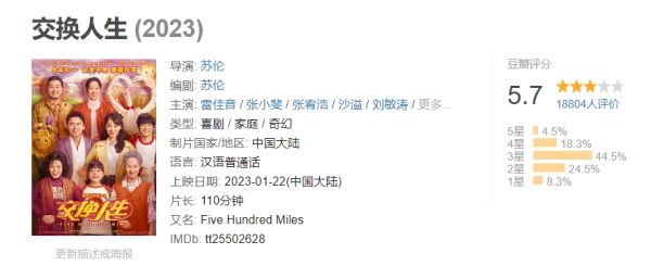 相比起《熊出没》这样一部大黑马,电影《交换人生》则意外展现出低迷之势,在大年初二就即将黯然落败,被其他新片牢牢甩在后面,无论是票房成绩,还是口碑都呈现出不断低迷的态势,评分5.7分,票房排名第六名,在春节档电影中排名最末。