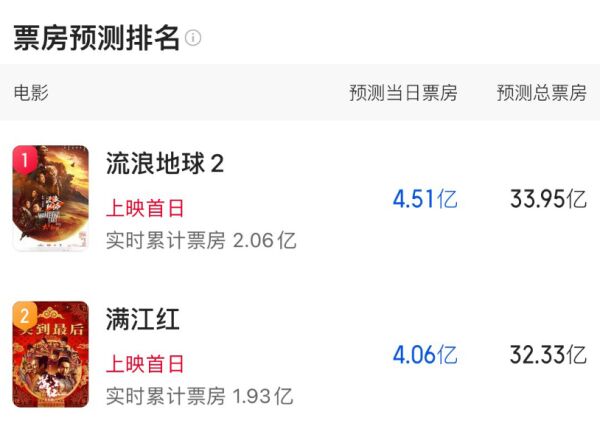 在经过一天时间后,《流浪地球2》口碑没有崩塌,其特效和阵容相比起《满江红》来说,还要高出一截,不过也有眼尖的网友发现,在经过第一天的票房大战之后,《球2》本来应该占据上风,打败《满江红》, 且两者的票房差距将会被拉大。
