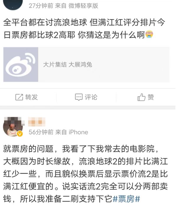 有网友质疑是资本作祟,是《满江红》在资本运作下抢了《球2》的票房,也有网友认为跟电影时长有关。