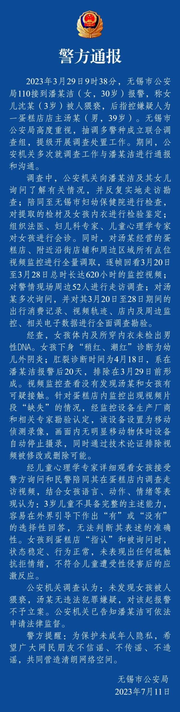 2023年3月29日9时38分,无锡市公安局110接到潘某洁 (女,30岁 ) 报警,称女儿沈某 (3岁 ) 被人猥亵,后指控嫌疑人为一蛋糕店店主汤某 (男,39岁 )。无锡市公安局高度重视,抽调多警种成立联合调查组,提级开展调查处置工作。期间,公安机关多次就调查工作与潘某洁进行通报和沟通。公安机关向潘其法乃其女川调查中询问了解有关情况,并反复实地走访勘查;陪同至无锡市妇保健院进行检查,对提取的检材及女孩内衣进行检验鉴定;组织法医、妇儿科专家、儿童心理学专家对女孩进行会诊。同时,对汤某经营的蛋糕店、附近沿街店铺和周边区域所有点位视频监控进行全量调取,逐帧回看3月20日至3月28日总时长达620小时的监控视频:对警情现场周边52人进行走访调查;对汤某多次询问,并对其3月20日至28日期间的出行消费记录、视频轨迹、店内及周边监控、相关电子数据进行全面调查勘验。经查,女孩体内及所穿内衣未检出男性DNA。女孩下身“稍红、潮红”诊断为幼儿外阴炎;肛裂诊断时间为4月18日,系在潘某洁报警后20天,排除在3月29日前形成。视频监控查看没有发现汤某和女孩有可疑接触。针对蛋糕店内监控出现视频片段“缺失”的情况,经监控设备生产厂商和相关专家勘验认定,该设备设置为移动侦测录像,画面内无明显移动物体时设备自动停止摄录,同时通过技术论证排除视频被修改或删除可能。