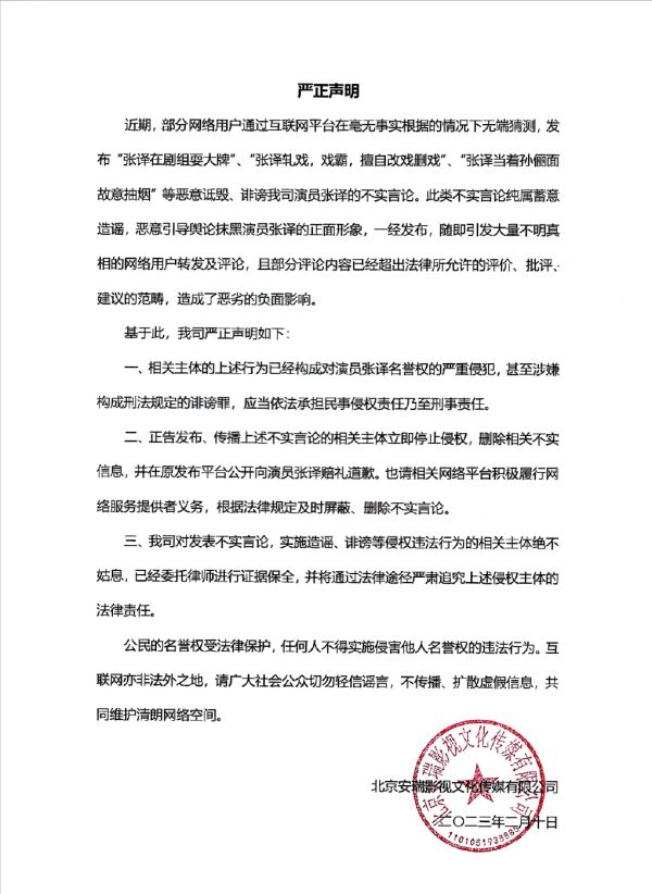 称此类不实言论纯属蓄意造谣,恶意引导舆论抹黑演员张译的正面形象,造成了恶劣的负面影响。要求相关侵权主体立即删除并公开道歉,并将通过法律途径严肃追究上述侵权主体的法律责任。