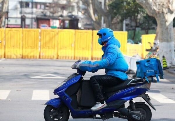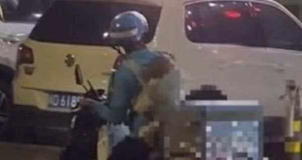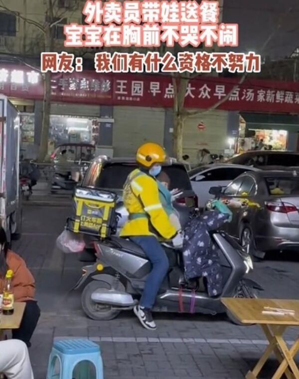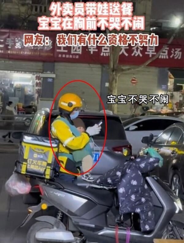 我们可以看到骑手戴着头盔,穿着黄色外卖服,看打扮的衣服应该是天气比较冷的季节,而骑手胸前背着一个宝宝,宝宝在怀里并没有睡着,而是醒着的。但是宝宝并没有因为不适而哭闹。