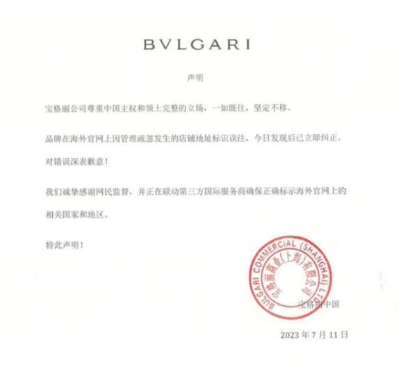 对此,宝格丽发布声明称,尊重中国主权和领土完整的立场,一如既往,坚定不移。品牌在海外官网上因管理疏忽发生的店铺地址标识误注,今日发现后已立即纠正对错误深表歉意!