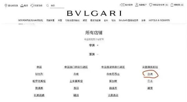 据媒体报道,近日有网友发现,在宝格丽品牌官网的店铺分布信息中,香港、澳门前加了“中国”二字,而在台湾前并未加“中国”两个字。该行为引发网友质疑,认为宝格丽此举是在将台湾列为一个国家。