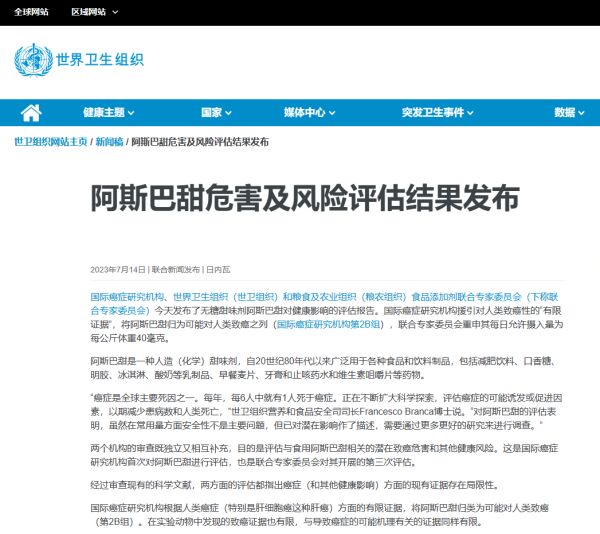 导读:据世卫官网消息,国际癌症研究机构援引对人类致癌性的“有限证据”,将阿斯巴甜归为可能对人类致癌之列,重申每日允许摄入量为每公斤体重40毫克。
