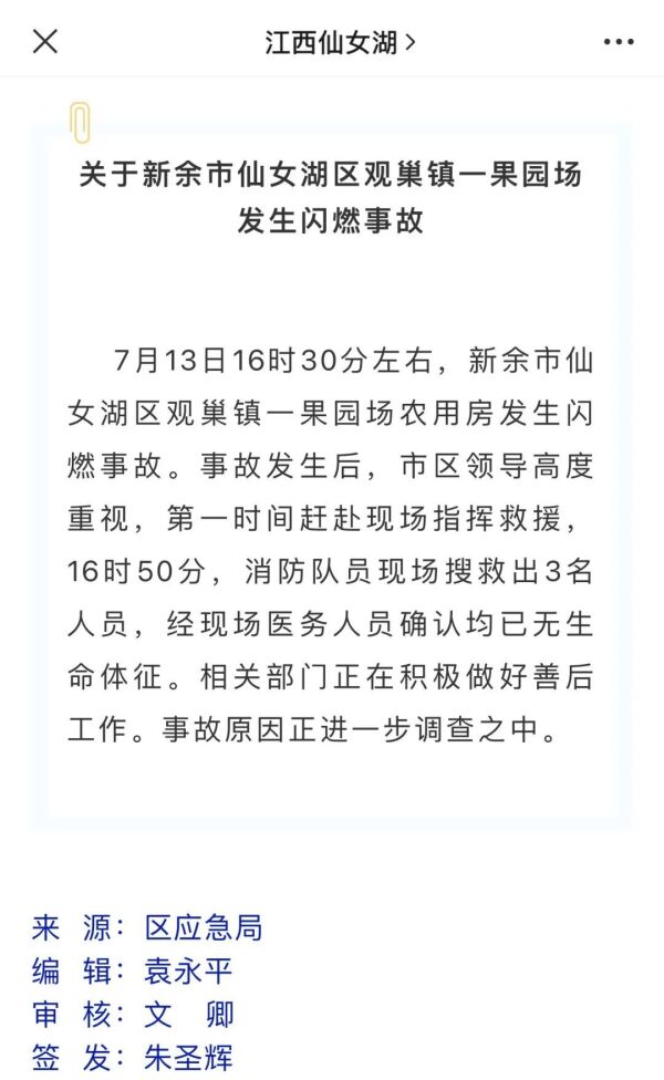 导读:7月13日,江西省一果园场农用房发生闪燃事故。消防救援人员现场搜救出3名人员,均已无生命体征。目前,事故原因正进一步调查之中。