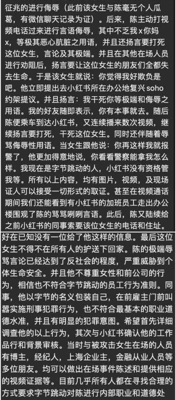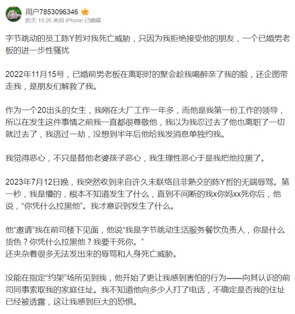 日前,有微博网友发帖称,遭到字节跳动员工陈Y哲的死亡威胁,只因为拒绝接受他(陈Y哲)的朋友,一个已婚男老板的进一步性骚扰。