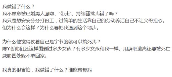 “我做错了什么?我不愿意被已婚男人强吻、带走、持续骚扰我错了吗?我只是想安安分分打份工,过简单的生活靠自己的劳动养活自己不让父母担心。为什么要把我逼到这个地步。”该女生表示自己非常害怕。