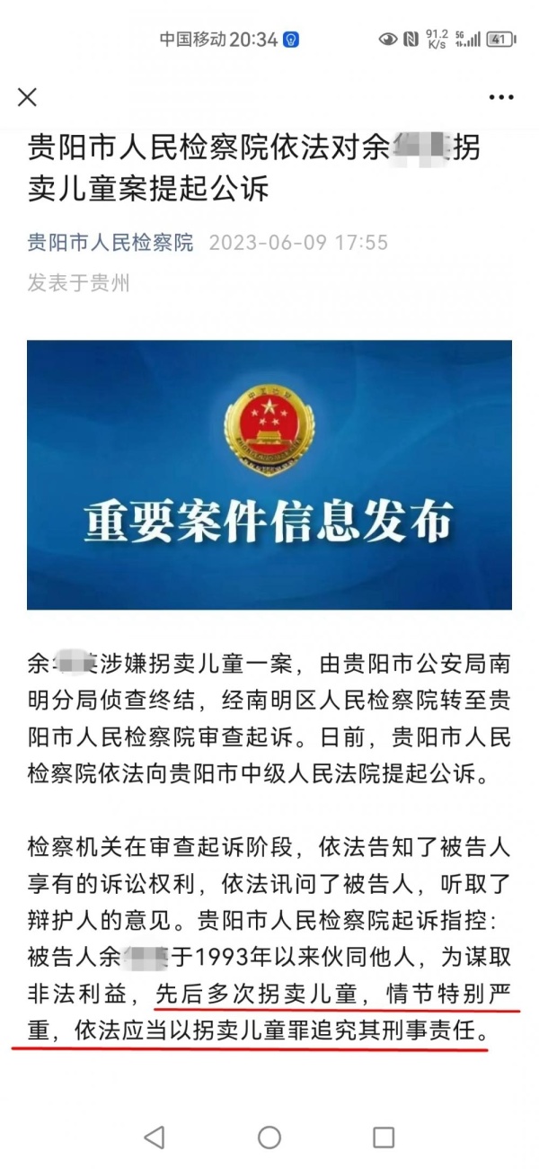 ▲贵阳市人民检察院发文称,被告人余某多次拐卖儿童,情节特别严重。图片来源/网页截图