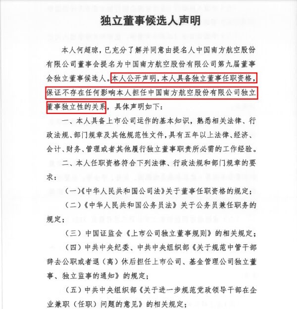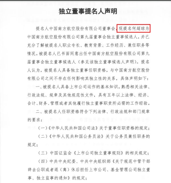 此次成为南航独立董事候选人,何超琼在公告中声明:本人具备独立董事任职资格,保证不存在任何影响本人担任南方航空独立董事独立性的关系。