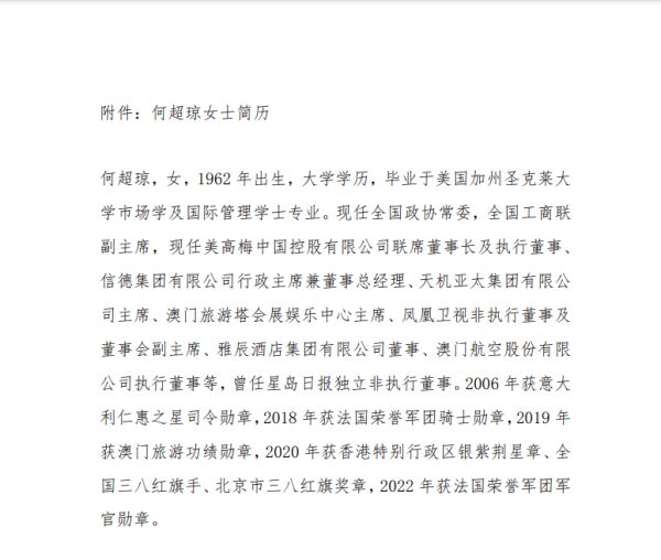 南航披露的简历显示,何超琼于1962年出生,大学学历,毕业于美国加州圣克莱大学市场学及国际管理学士专业。现任美高梅中国控股有限公司联席董事长及执行董事、信德集团有限公司行政主席兼董事总经理、天机亚太集团有限公司主席、澳门旅游塔会展娱乐中心主席、凤凰卫视非执行董事及董事会副主席、雅辰酒店集团有限公司董事、澳门航空股份有限公司执行董事等,曾任星岛日报独立非执行董事。