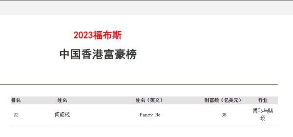 在今年发布的2023福布斯中国香港富豪榜上,何超琼以38亿美元(约271亿元人民币)的财富数,排名榜单第22位。