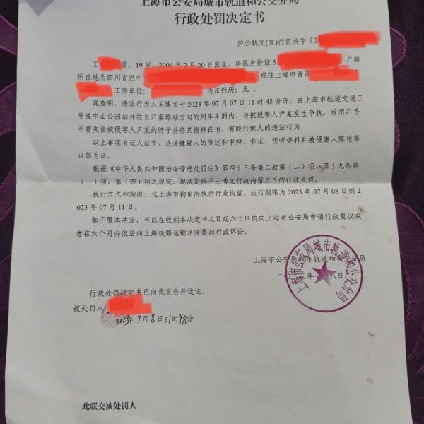 上海市公安局城市轨道交通和公交分局出具的《行政处罚书》显示,王文成于7月7日11时45分许,在上海市轨道交通三号线中山公园站开往长江南路站方向的列车车厢内,与被侵害人尹某发生争执,后用右手手臂夹住被侵害人尹某的脖子并将其抱摔在地,有殴打他人的违法行为。决定给予王文成行政拘留三日的行政处罚。