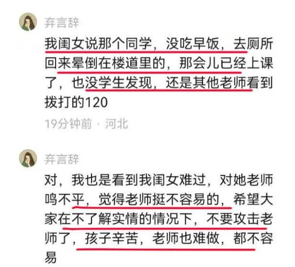 如果学生被罚站中暑身亡是实情,学校和相关老师都逃脱不了责任,但也有其他人给出不一样的信息,一名孩子家属说,自己闺女就在那所中学,身亡的学生当天是上厕所回来晕倒在楼道里,最后老师发现拨打了120急救电话。