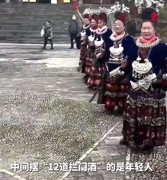 对此,景区工作人员表示,两边站的都是年长的,中间摆“12道拦门酒”是年轻人,按照我们苗族的礼节,年轻人来敬酒是迎客的一种方式。