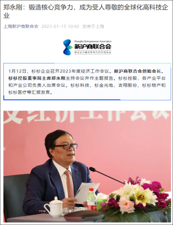 据报道,1月12日,杉杉企业召开2023年度经济工作会议。郑永刚主持会议并作主题报告。杉杉控股、各产业平台和产业公司负责人出席会议。杉杉科技、杉金光电、吉翔股份、杉杉物产和杉杉医疗等汇报发言。