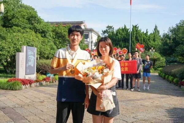 合影时,张鑫亮胸前挂着象征数学奥林匹克竞赛最高荣誉的金牌。