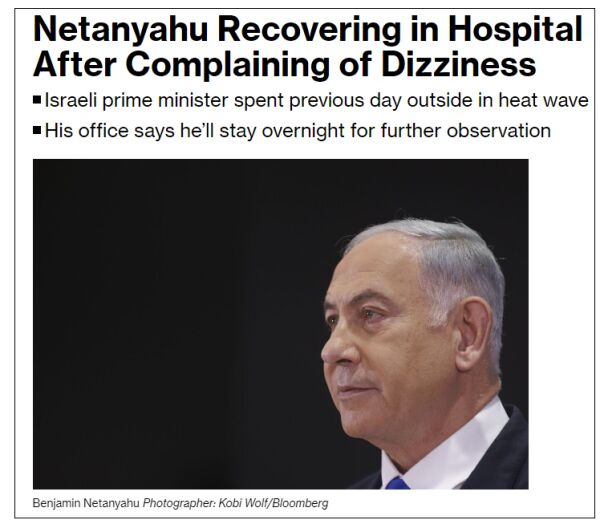 (观察者网讯)据彭博社报道,以色列总理内塔尼亚胡的办公室表示,73岁的内塔尼亚胡7月15日因脱水被送往靠近他私人住宅的谢巴医院接受治疗,并遵照医嘱在那里过夜。