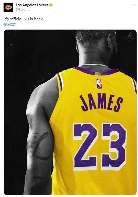 今天凌晨,湖人官方正式宣布,新赛季詹姆斯的球衣号将从6号改为湖人夺冠赛季穿着的23号。