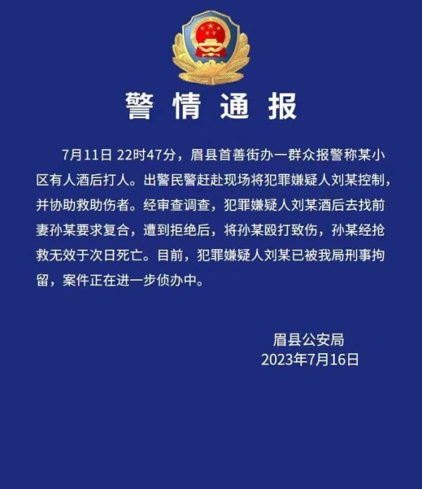 7月11日22时47分,眉县首善街办一群众报警称某小区有人酒后打人。出警民警赶赴现场将犯罪嫌疑人刘某控制,并协助救助伤者。经审查调查,犯罪嫌疑人刘某酒后去找前妻孙某要求复合,遭到拒绝后,将孙某殴打致伤,孙某经抢救无效于次日死亡。目前,犯罪嫌疑人刘某已被我局刑事拘留,案件正在进一步侦办中。