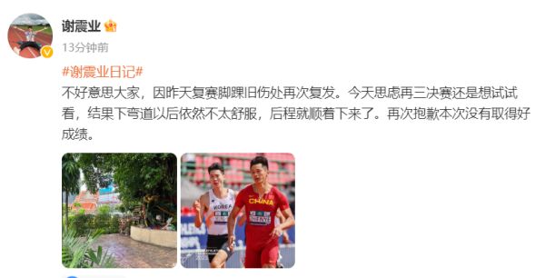 赛后他在个人微博上致歉,也回应了自己减速的原因。“不好意思大家,因昨天复赛脚踝旧伤处再次复发。今天思虑再三决赛还是想试试看,结果下弯道以后依然不太舒服,后程就顺着下来了。再次抱歉本次没有取得好成绩。”此前谢震业一直尝试冲击布达佩斯世锦赛的达标线。期待谢震业可以度过状态和伤病低谷,继续向布达佩斯世锦赛和巴黎奥运会发起冲击。(文/北青体育 褚鹏)