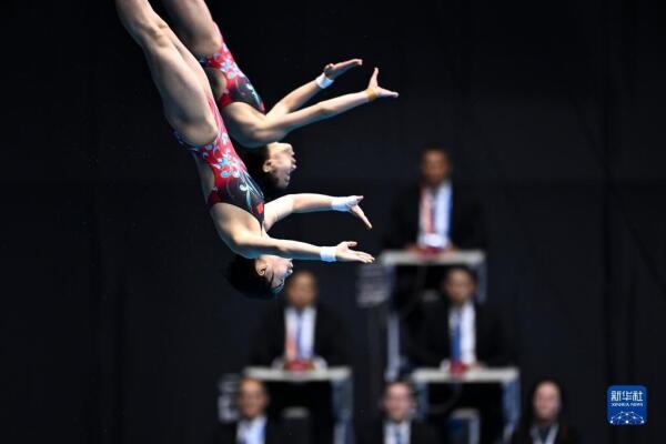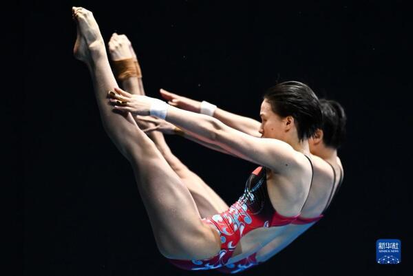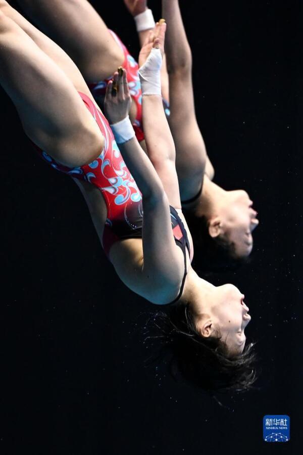 7月16日,陈芋汐(前)/全红婵在比赛中。当日,在日本福冈举行的2023年福冈世界游泳锦标赛跳水女子双人10米台决赛中,中国组合陈芋汐/全红婵以369.84分的总成绩夺得冠军。新华社记者 许畅 摄