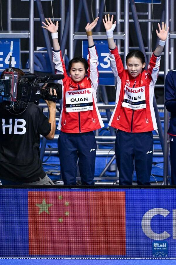7月16日,陈芋汐(右)/全红婵在比赛前登场。当日,在日本福冈举行的2023年福冈世界游泳锦标赛跳水女子双人10米台决赛中,中国组合陈芋汐/全红婵以369.84分的总成绩夺得冠军。新华社记者 许畅 摄