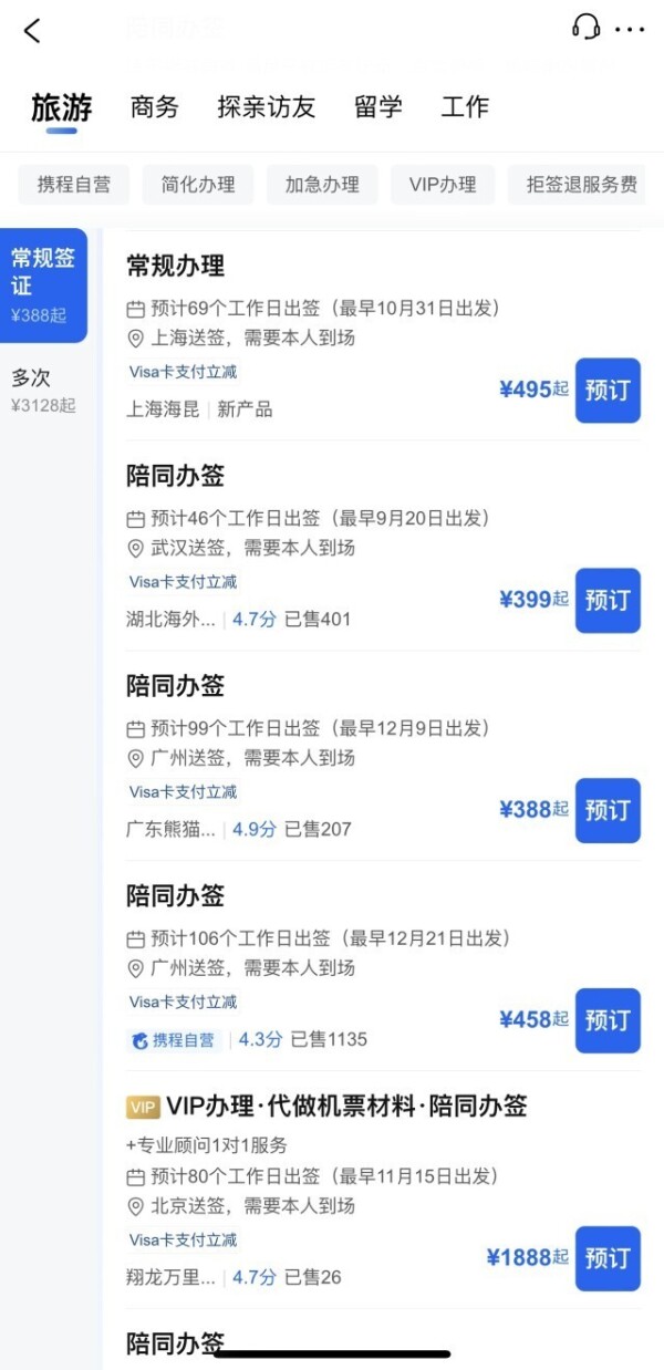 而在在线旅游平台,以法国签证为例,上海地区送签常规办理显示最早10月31日出发。武汉送签显示最早9月20日出发。而广州送签则显示最早出发时间在12月。