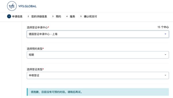 如在威孚仕官网,在国内多个城市的德国签证申请中心申请短期申根签证都显示“目前没有可预约时段”。