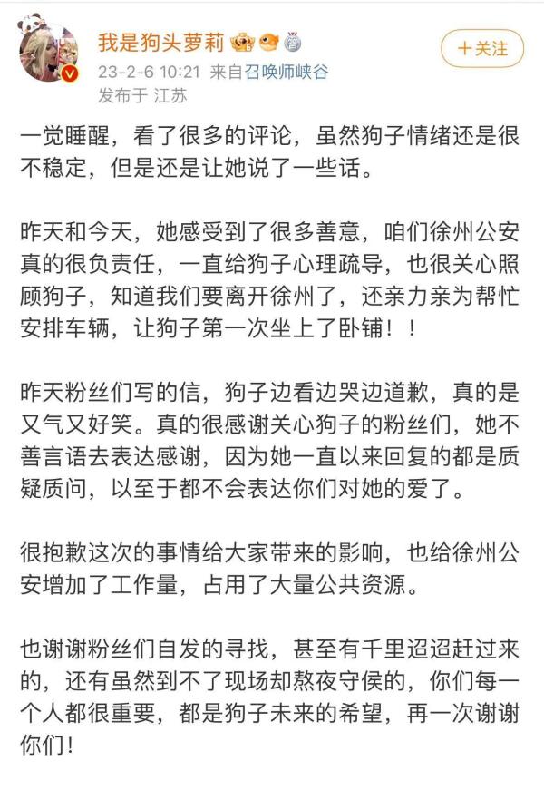 2月5日上午,有网友发布视频,疑似“我是狗头萝莉”在一处废墟旁被拍到,并称“目前情绪不太稳定,但是身体没什么问题,谢谢大家关心。”南都记者就此联系该网友未获回应。此外,多名“我是狗头萝莉”的粉丝称,“我是狗头萝莉”被找到后,目前仍在徐州。
