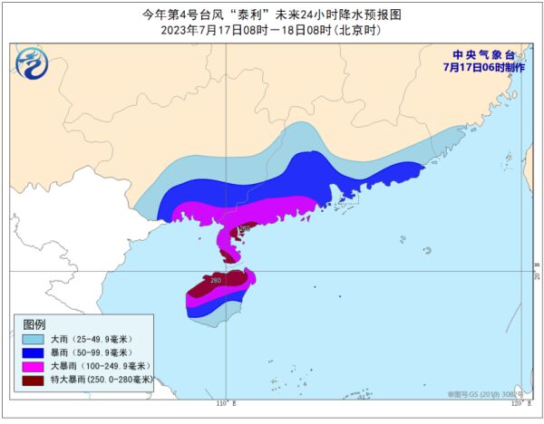 降水预报:7月17日08时至18日08时,广东西部和南部、广西中南部、海南岛、福建南部等地部分地区有大到暴雨,其中,广西南部、广东西南部、海南岛中北部等地部分地区有大暴雨,广东西南部沿海、海南岛北部等地局地特大暴雨(250~280毫米)。