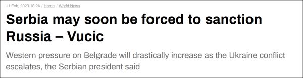 导读:2月11日,塞尔维亚总统武契奇表示,由于西方对塞尔维亚施加压力,塞尔维亚可能将不得不对俄罗斯实施制裁。