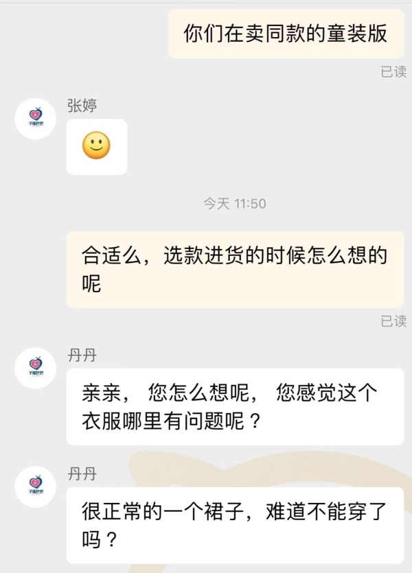 当天,记者以消费者身份询问了两家售卖该裙款的童装店客服,其中一客服人员回应称“这衣服哪里有问题呢?很正常的一个裙子,难道不能穿了吗”。另一家店的客服人员在简单沟通后,将裙子页面换为另外一款裙子。