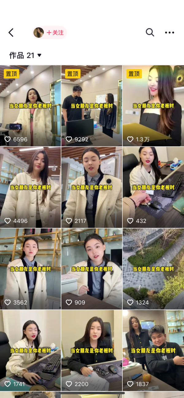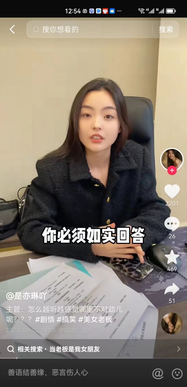 从第一个视频看,更新是从去年12月开始发,也就是刚开通没多久,再从内容看,应该是签约了网红公司,拍段子吸粉,本身出镜担任“老板”角色。