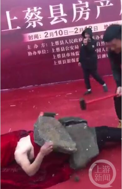 ▲2月10日,上蔡县房产展销会,有人表演铁锤碎石。图片来源/受访者供图
