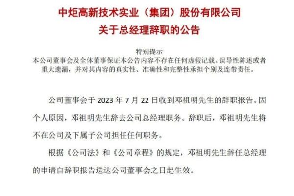 中炬高新公告,公司董事会于2023年7月22日收到邓祖明的辞职报告。因个人原因,邓祖明辞去公司总经理职务。辞职后,邓祖明将不在公司及下属子公司担任任何职务。