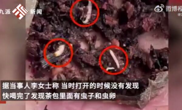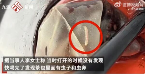 当事人李女士表示:当时打开的时候没有发现,快喝完了发现茶包里面有虫子和虫卵,随后打开茶包里面竟有数只虫子和虫卵,当场觉得很生气。